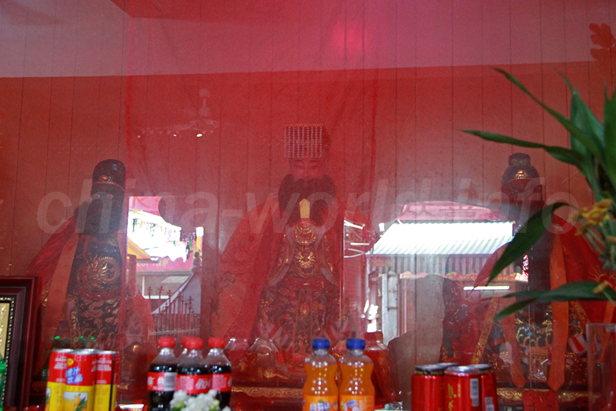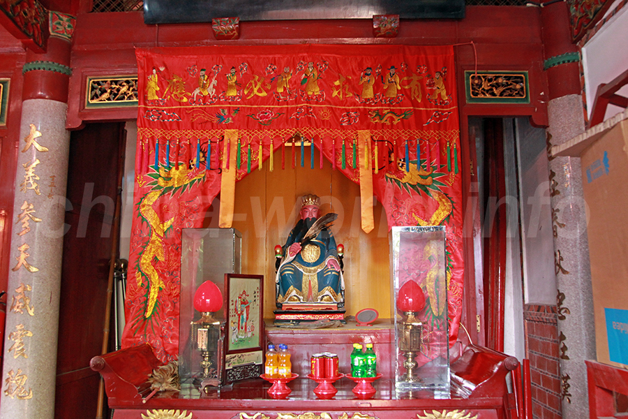 三義廟二階の祭壇。こちらにも小さいながら劉関張像が祭られている。