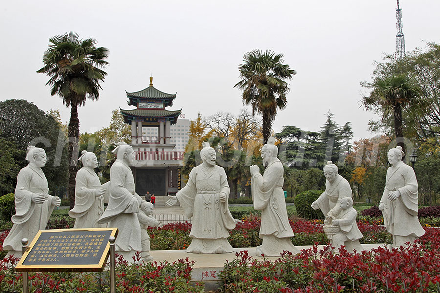 許昌市内をフラフラしているときに、開封太郎さんからメッセージが来たのでついでに訪れてみた。まあ、陳寔と荀淑がメインなので後漢末かなとは思うのだが。まあ、陳紀とか荀彧の父親あたりも一緒のようだったので、いいかな。徳星亭自体は近年再建されたものだし、いかにもというコンクリート製なので味わいもクソもない。その前には陳寔と荀淑たちの像が並んでいる。写真を撮っていると、人民オネエチャンが興味を持ったらしく、説明文を読み始め、携帯で写真を撮りだした。でも陳寔と荀淑なんて知っているのかな。