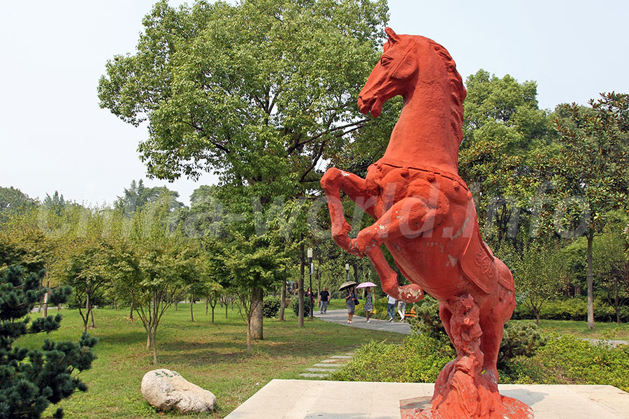 劉備が荆州を占領後、関羽が「春秋」を読むために、この楼閣を与えられた。 楼閣内部。関羽が「春秋」を読む像がある。 春秋閣前に置かれた赤兎馬の像。 基本情報 【訪問時期】2015年9月20日 【関連人物】関羽 【文物保護】– ちょこっと解説 探訪後記 ネットで遺跡情報を探していると、荆州にも武侯祠があるという情報があった。しかし「ある」はずなのに写真は一枚も出てこない。これって、やっぱり「ない」パターンですよね。どうして「あった」という表現ができないのだろう。とりあえず中山公園内をくまなく探したが、武侯祠の存在は確認できず。しかし春秋閣という建物があった。春秋と荆州とくれば、やはりアレですね。建物の中には関羽さんがいましたよ。まあ、関羽押しの荆州ですから、武侯祠より大事なんですよ。 位置情報 在野の士であるあなたはこの位置情報を閲覧できません。仕官申請しますか。 投稿情報【カテゴリ】湖北省 荆州市【 タグ 】関羽【公開範囲】校尉 都督 大将軍 丞相【掲載日時】2017年8月15日 07:29【更新日時】2019年1月13日 09:11 いいね! 293
