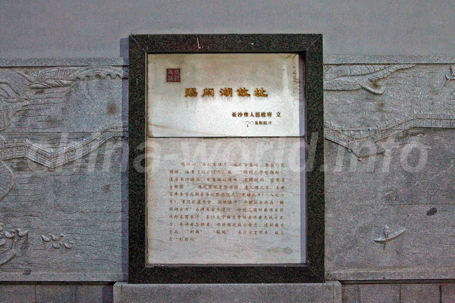 関羽が長沙に侵攻、太守韓玄は配下の黄忠が関羽との戦いで力を出していないと激怒、黄忠を斬首しようとする。それを知った部将魏延は黄忠を救け、さらには韓玄を殺そうと追いかける。そしてこの場所で韓玄を刺したとされる。実際は、賜閑湖は明代の庭園。「賜閑」と「刺韓」が長沙方言で発音が同じなため、こういう伝承が出てきたと思われる。