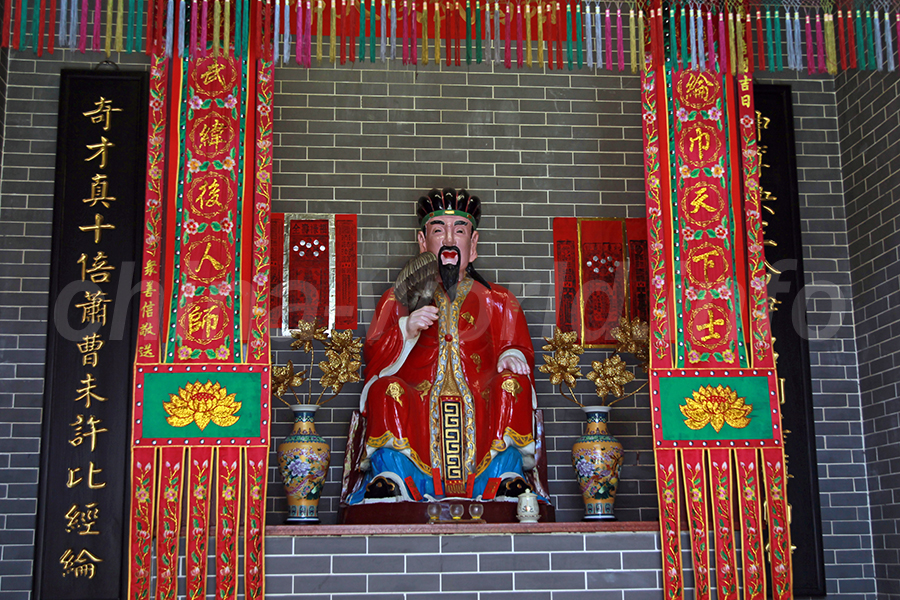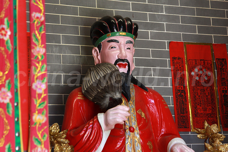 嶺后亨武侯廟主殿内、孔明像の近影。何かほかの神様が合わさった様子。