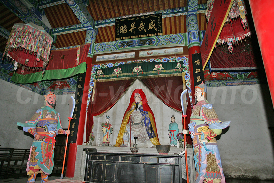 馬超祠内部。中央に馬超の像。その左右は龐徳と馬岱であるとのこと。