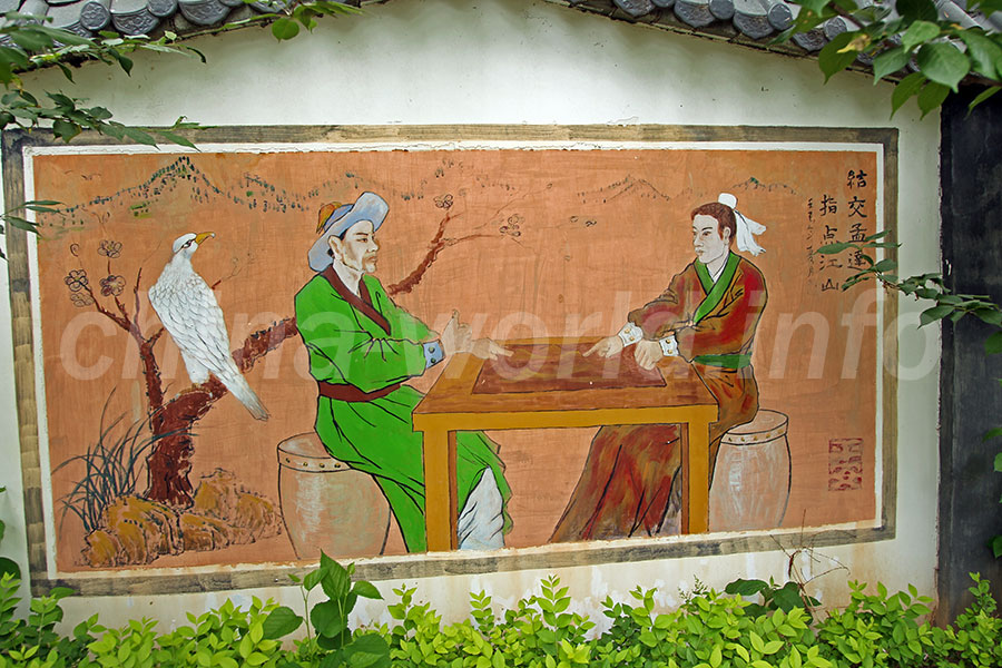 小法儀西坡に立てられている「法正故里」の石碑。 「結交孟達、指点江山」の図。法正と孟達が語る図。 「一代謀臣、漢法正像」の図。石碑東西の壁にたくさん描かれている。 「祖父法真、言伝身教」の図。法正とその祖父である法真。 基本情報 【訪問時期】2017年5月2日 【関連人物】法正 【文物保護】– ちょこっと解説 法正、字は孝直。雍州扶風郡郿県(現在の陝西省眉県湯峪鎮小法儀)の人。もとは劉璋の配下。法正は、劉備が成都に侵攻したときに、劉璋に投降を勧めている。後も劉備に漢中を取ることを進言するなど、その才識は劉備から大きな信任を得ていた。 法正故里、現在は「法正故里」と刻まれた石が立てられている。また小法儀西坡村から東の小法儀村、西の金寨村へ行く公路脇に法正の故事にまつわる図がいくつも描かれている。 探訪後記 位置情報 在野の士であるあなたはこの位置情報を閲覧できません。仕官申請しますか。 投稿情報【カテゴリ】陝西省 眉県【 タグ 】法正【公開範囲】校尉 都督 大将軍 丞相【掲載日時】2018年3月15日 00:20【更新日時】2019年1月12日 21:25 いいね! 268